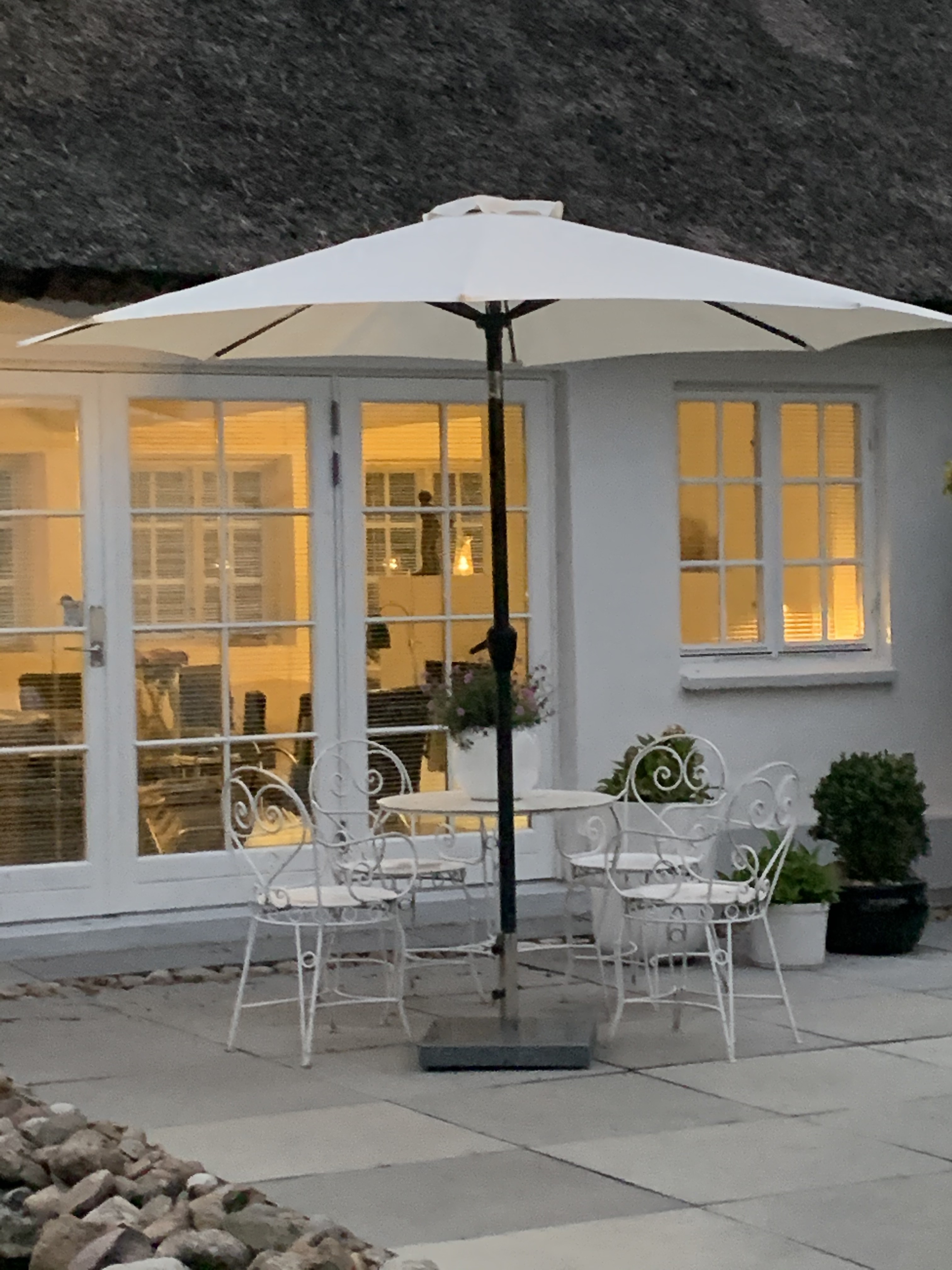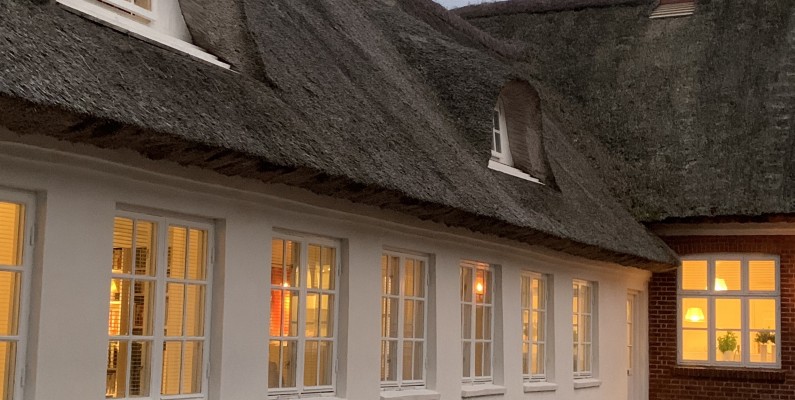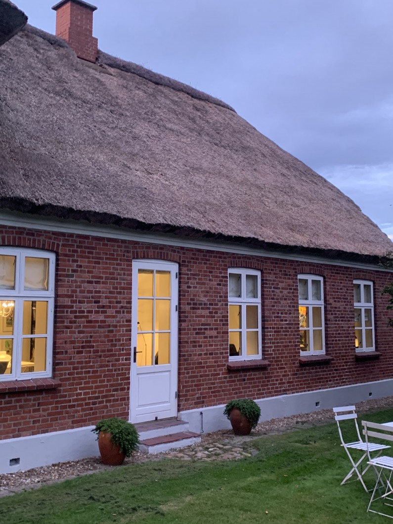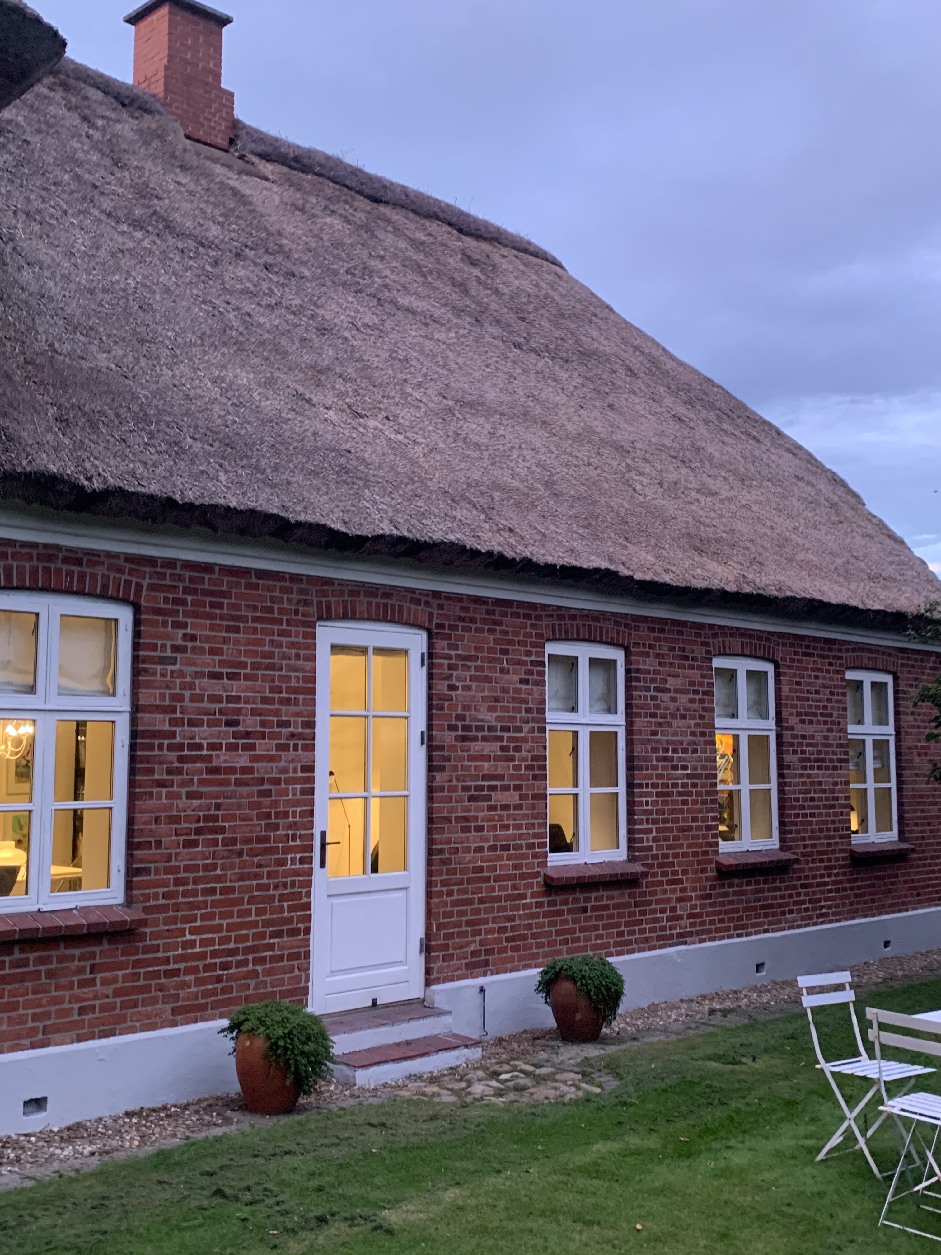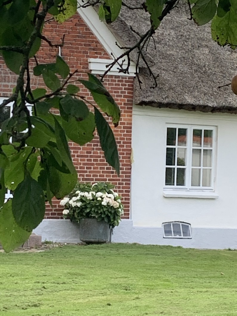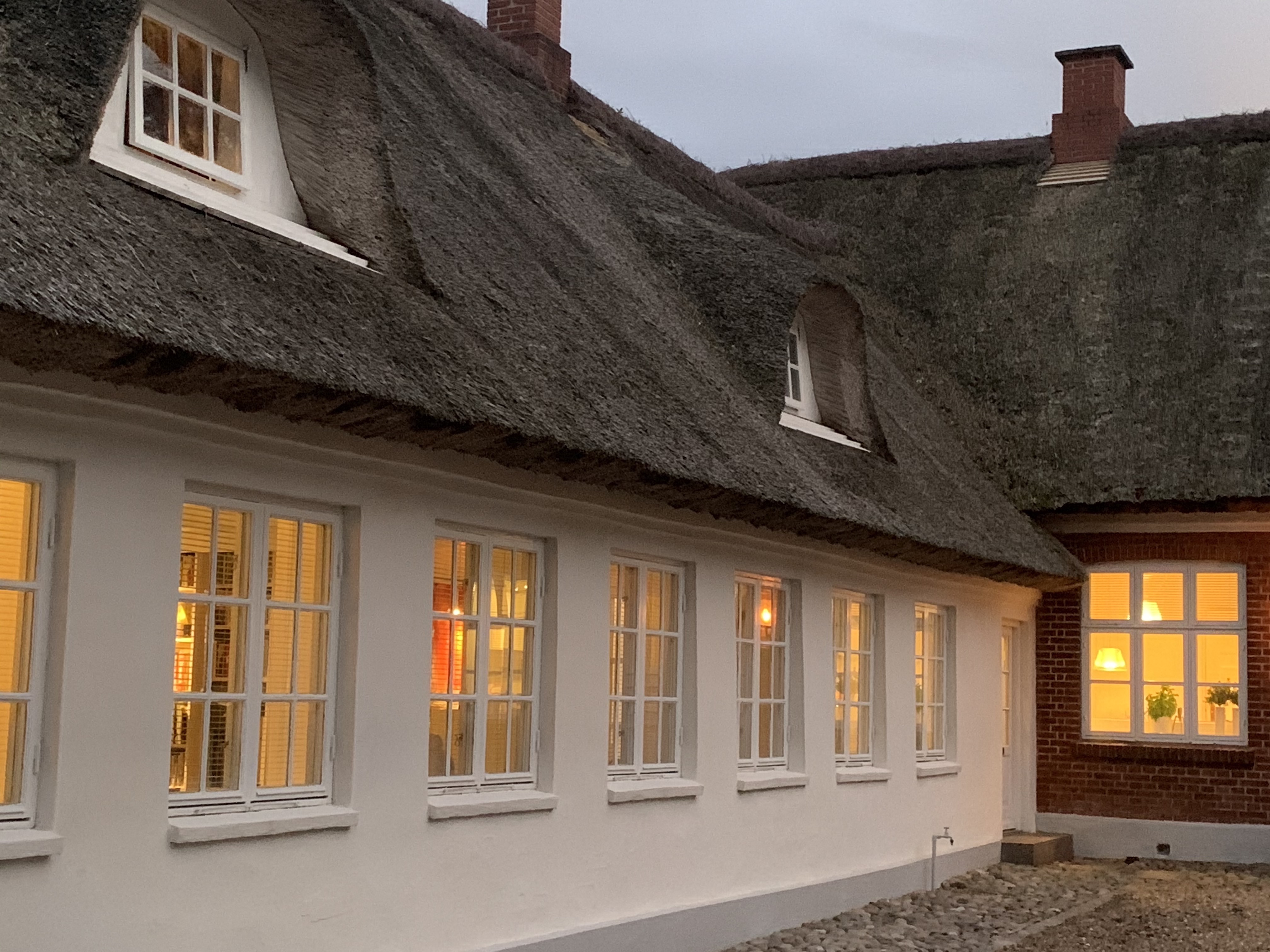 Alle vinduer, porte og døre er malet med hvid linoliemaling, som giver en smuk og holdbar overflade.