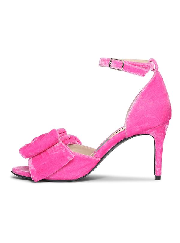 Blandt andet nogle forrygende sandaler i velour med store sløjfer og de fås i farverne pink, grøn og sort.