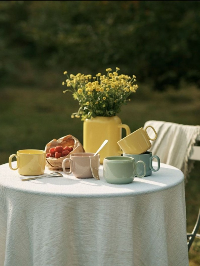 I sættet med fire krus, har hvert krus sit eget formsprog og farve, hvilket giver en uhøjtidelig stemning på køkkenhylden eller bordet.