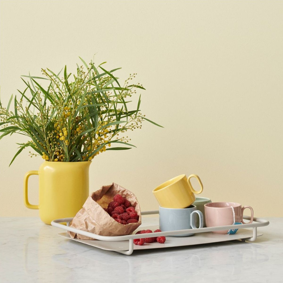 Skal kaffen eller teen serveres i stuen eller haven er CARRY-ON serveringsbakken en sikker hjælper. De høje kanter gør det nemt at holde styr på bakkens indhold, og giver samtidigt et godt greb, når den bæres. Med det minimalistiske design og den fine lysegrå farve, passer CARRY-ON sammen med de fleste stel.