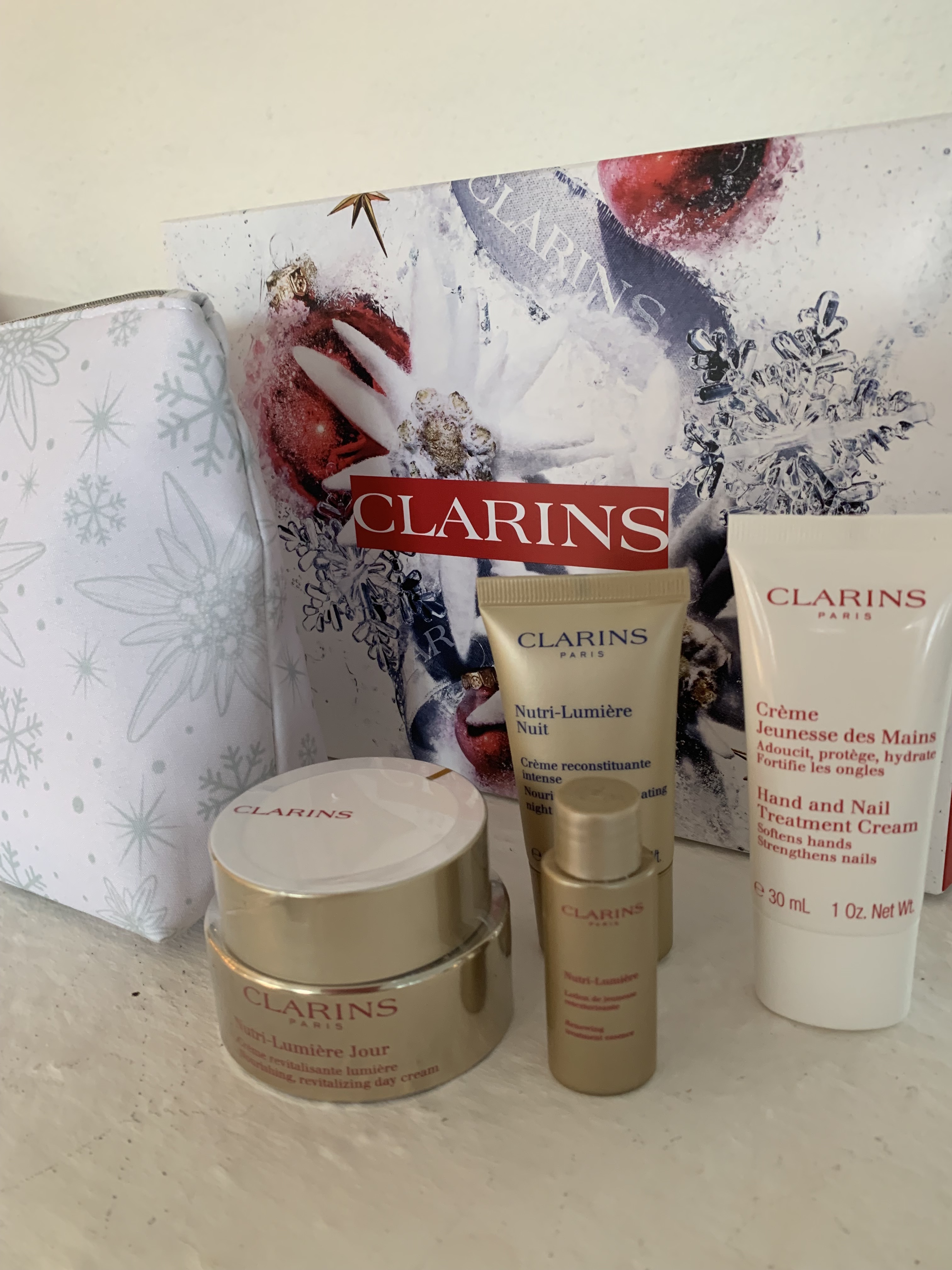 Clarins Nutri-Lumière Skincare Gaveæske indeholdende fire herlige produkter til en værdi af 1.400 kroner., men som i anledning af julen fås for 999 kroner og oven i købet ligger i den smukkeste  hvide toiettaske.