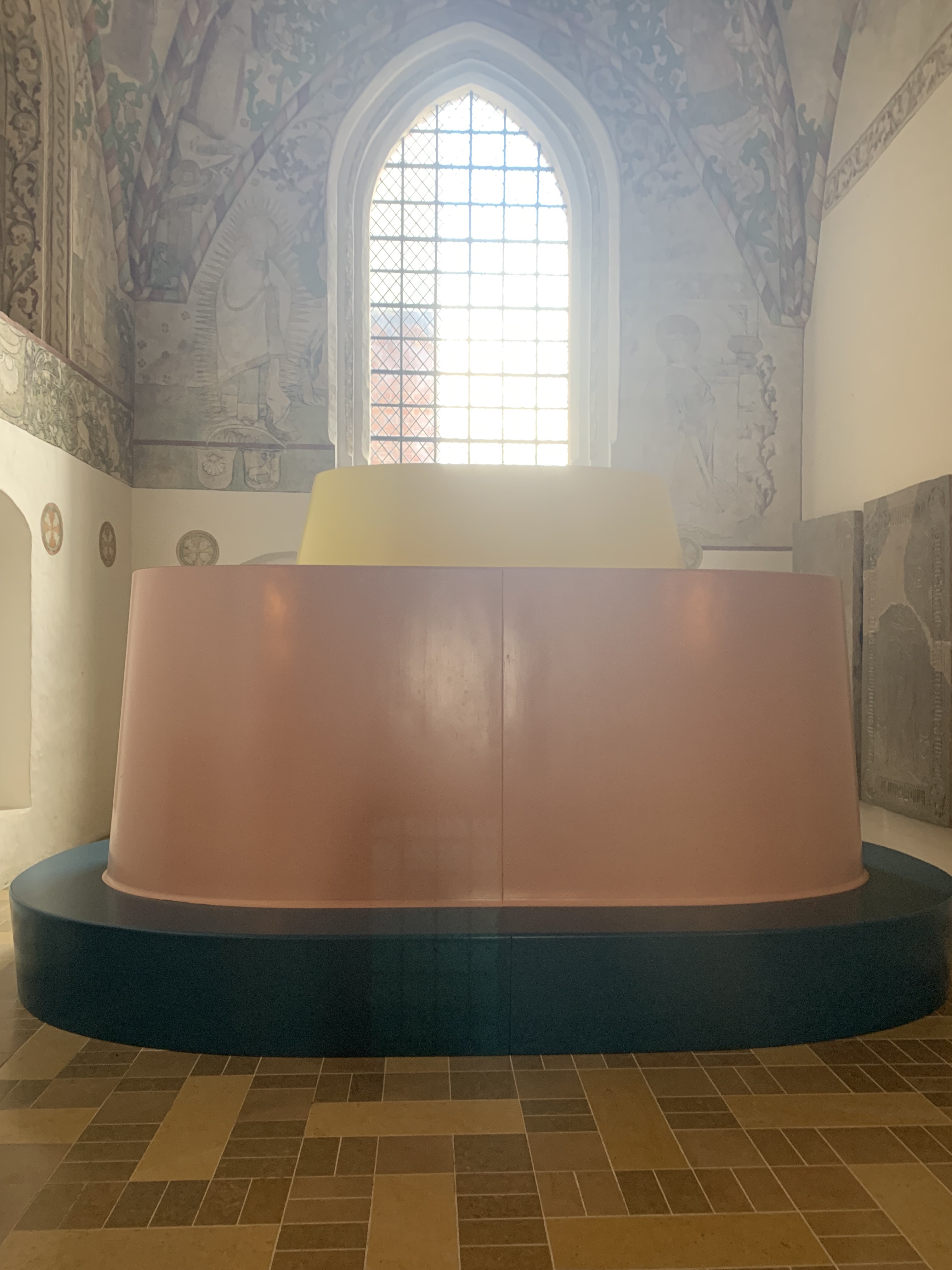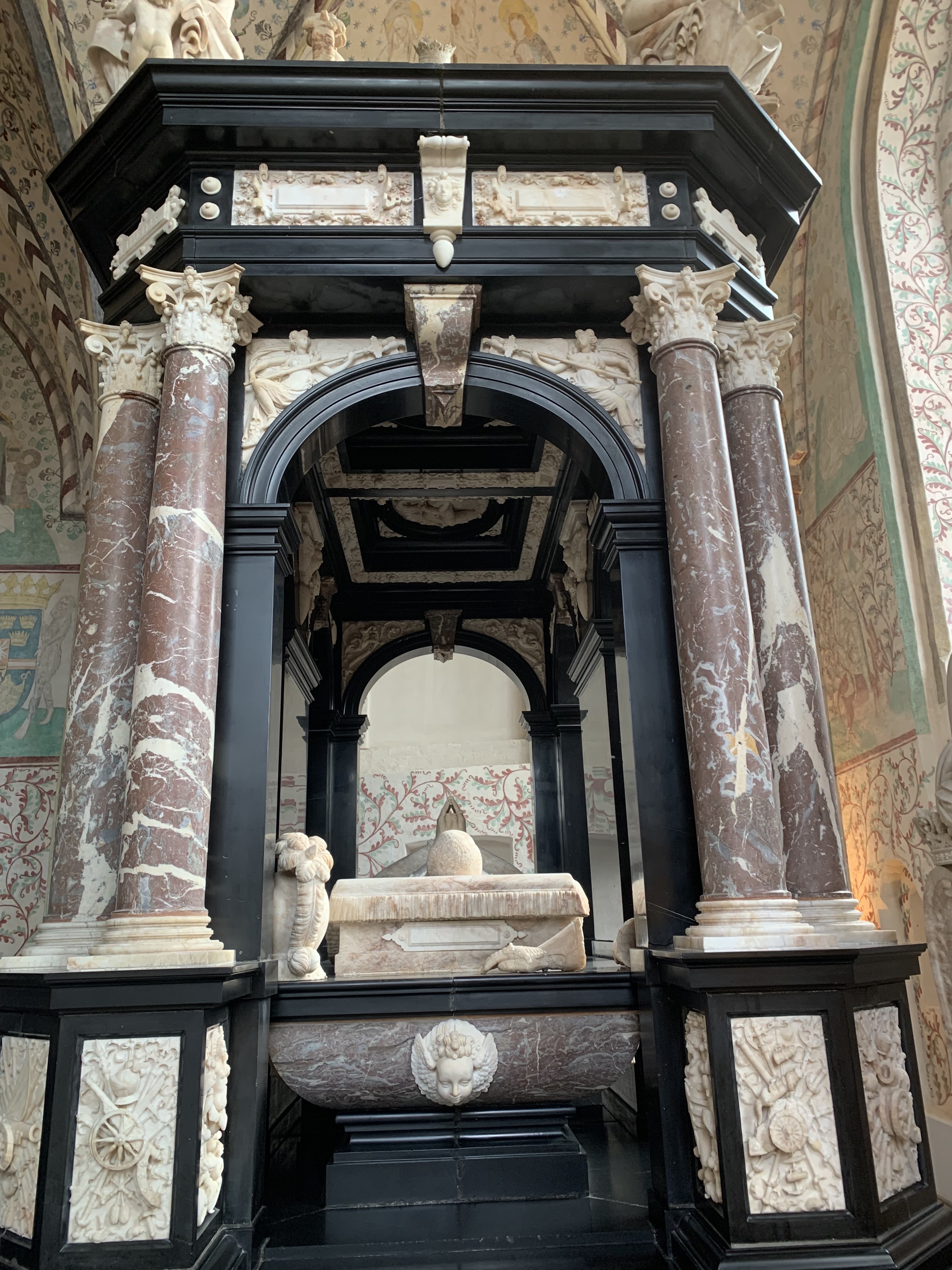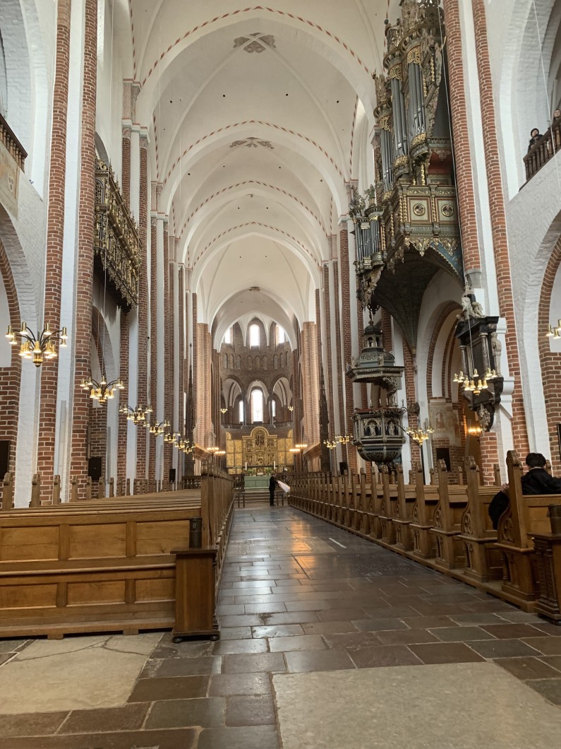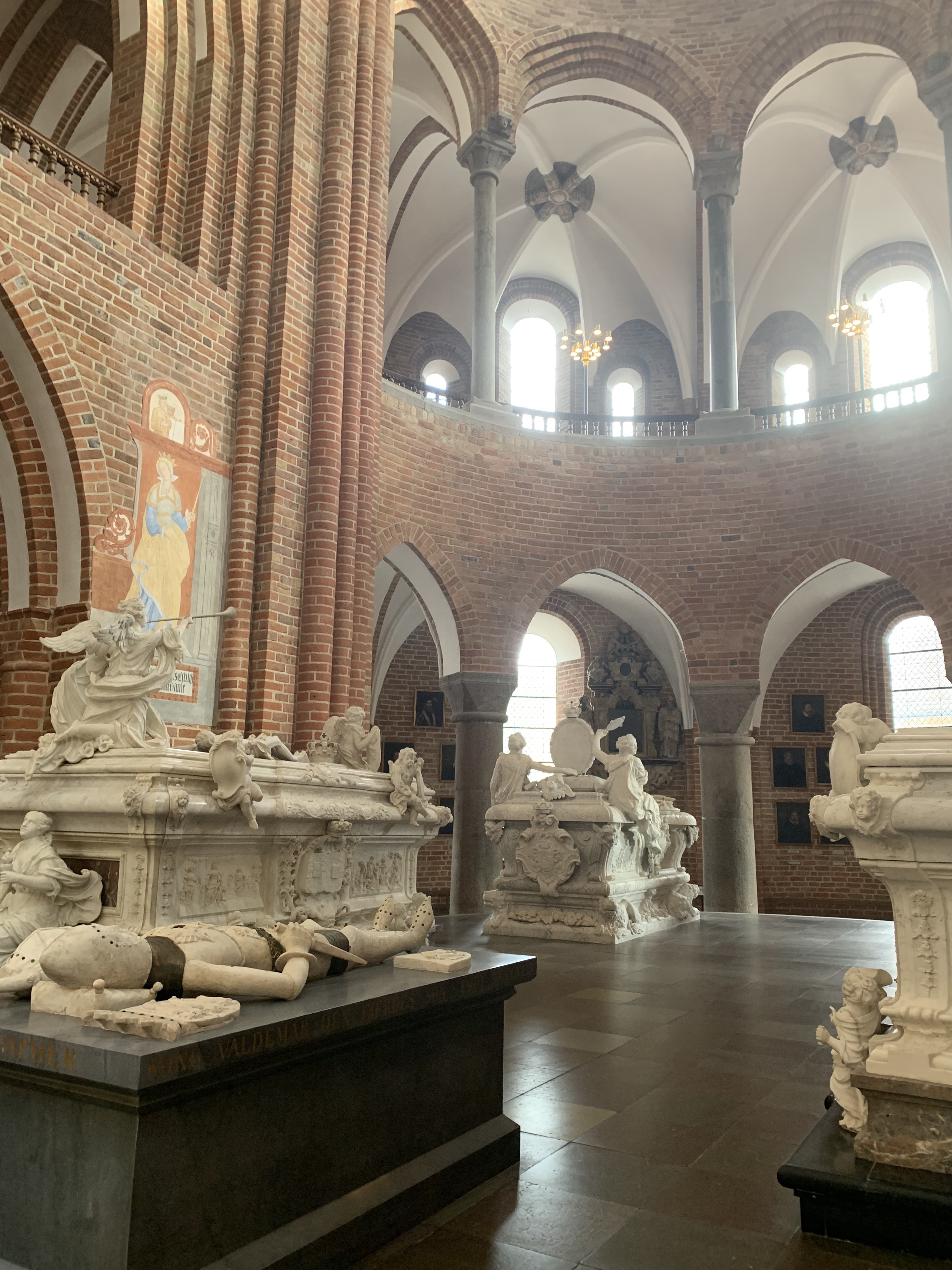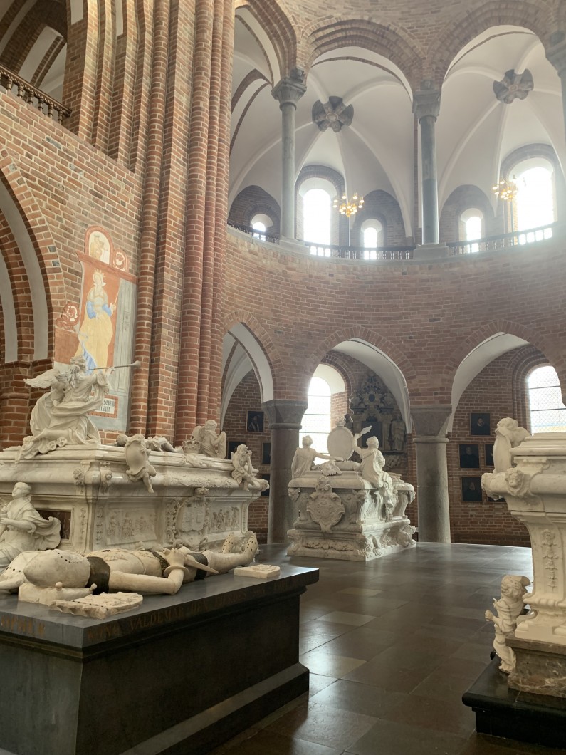 På vejen hjem mod hovedlandet svingede vi af til Roskilde for at se domkirken. Og det var et smuk oplevelse både at se kirken og de mange sarkofager i kirken, hvor 40 kongelige ligger begravet. Lige fra Harald Blåtand, Frederik 9., Svend Estridsen, Margrete 1., Frederik 2, Dronning Ingrid og altså mange andre.