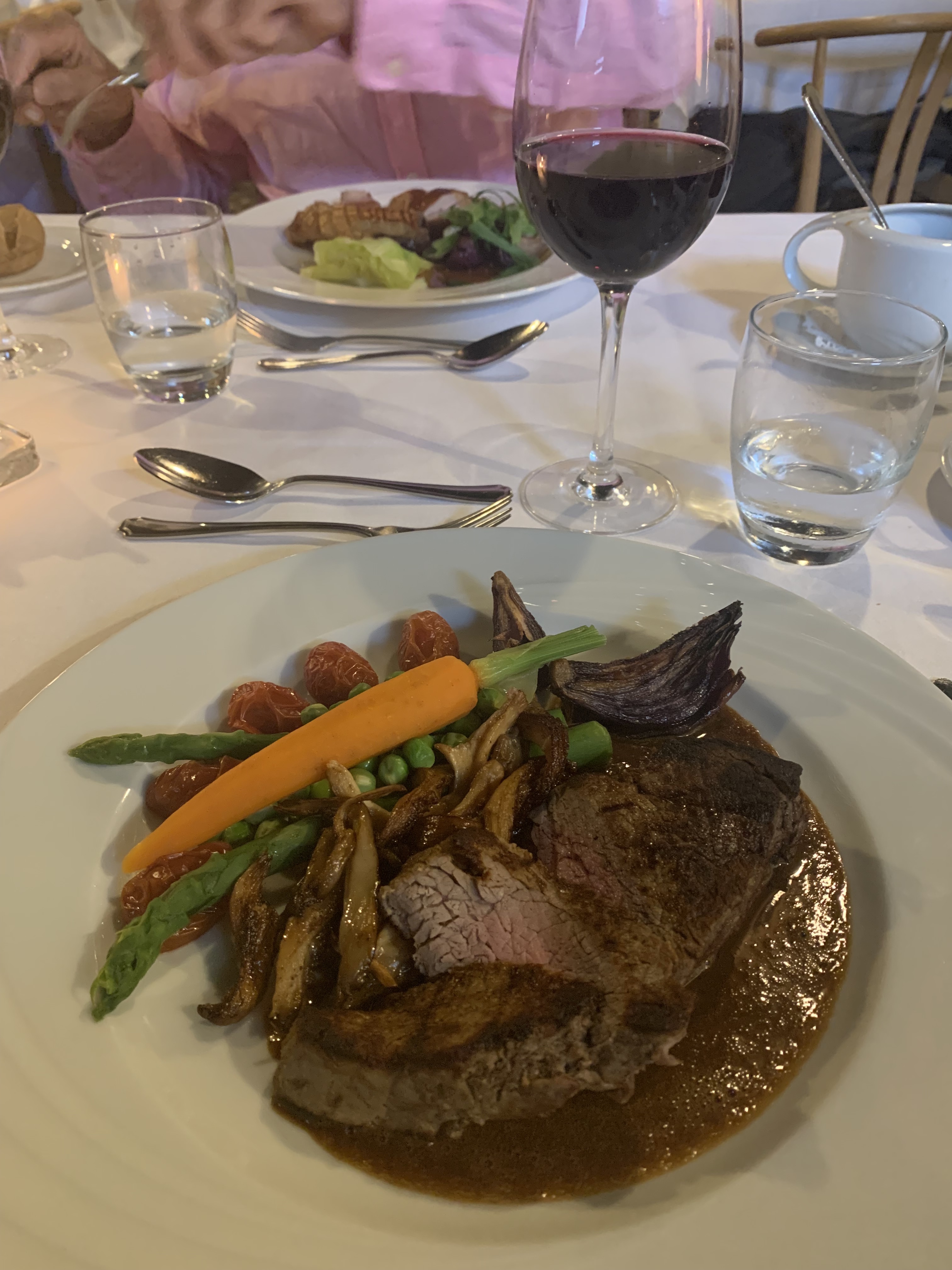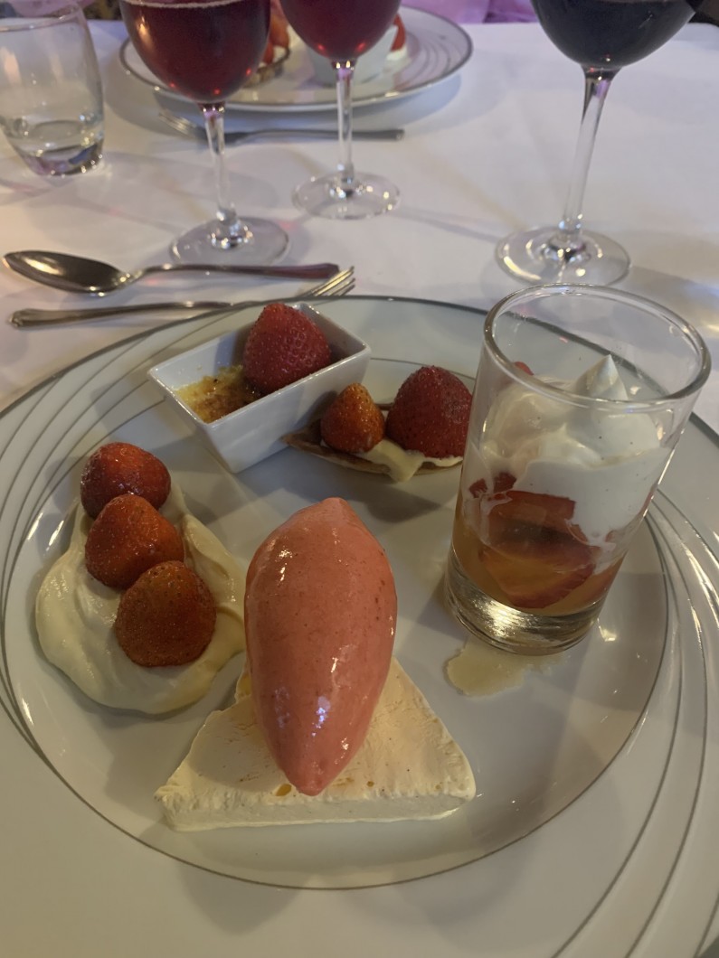 Senest valgte jeg oksemørbrad med langtidsbagte cocktailtomater og bagte rødløg, som fik følgeskab af friske ærter, svampe og nye gulerødder. Det var en himmerigsmundfuld, som blev fulgt til dørs af en symfoni af jordbær. På menukortet stod der fem små jordbærdesserter. Men små var de bestemt ikke. mens lækre de var de hver især.