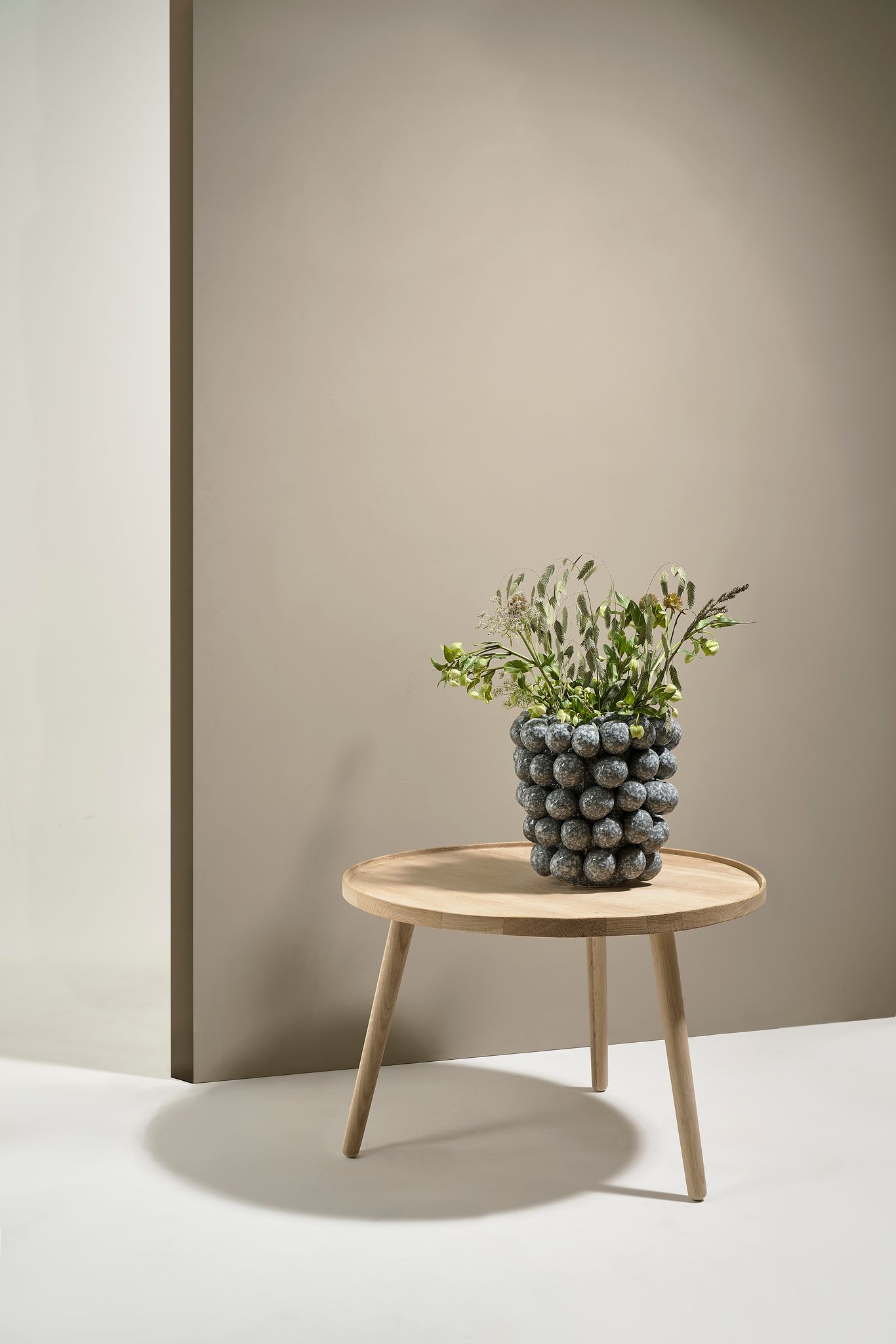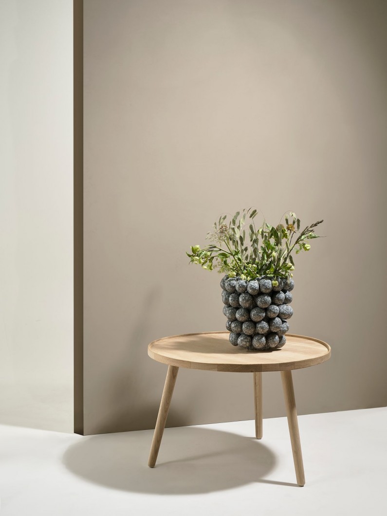 Egetræsbordet fås i farverne natural oiled og whitewashed oak og er 44,5 cm højt med en diameter på 70 cm. Sammen med loungestolen repræsenterer det et afslappet og ægte look produceret i materialer af høj kvalitet.
