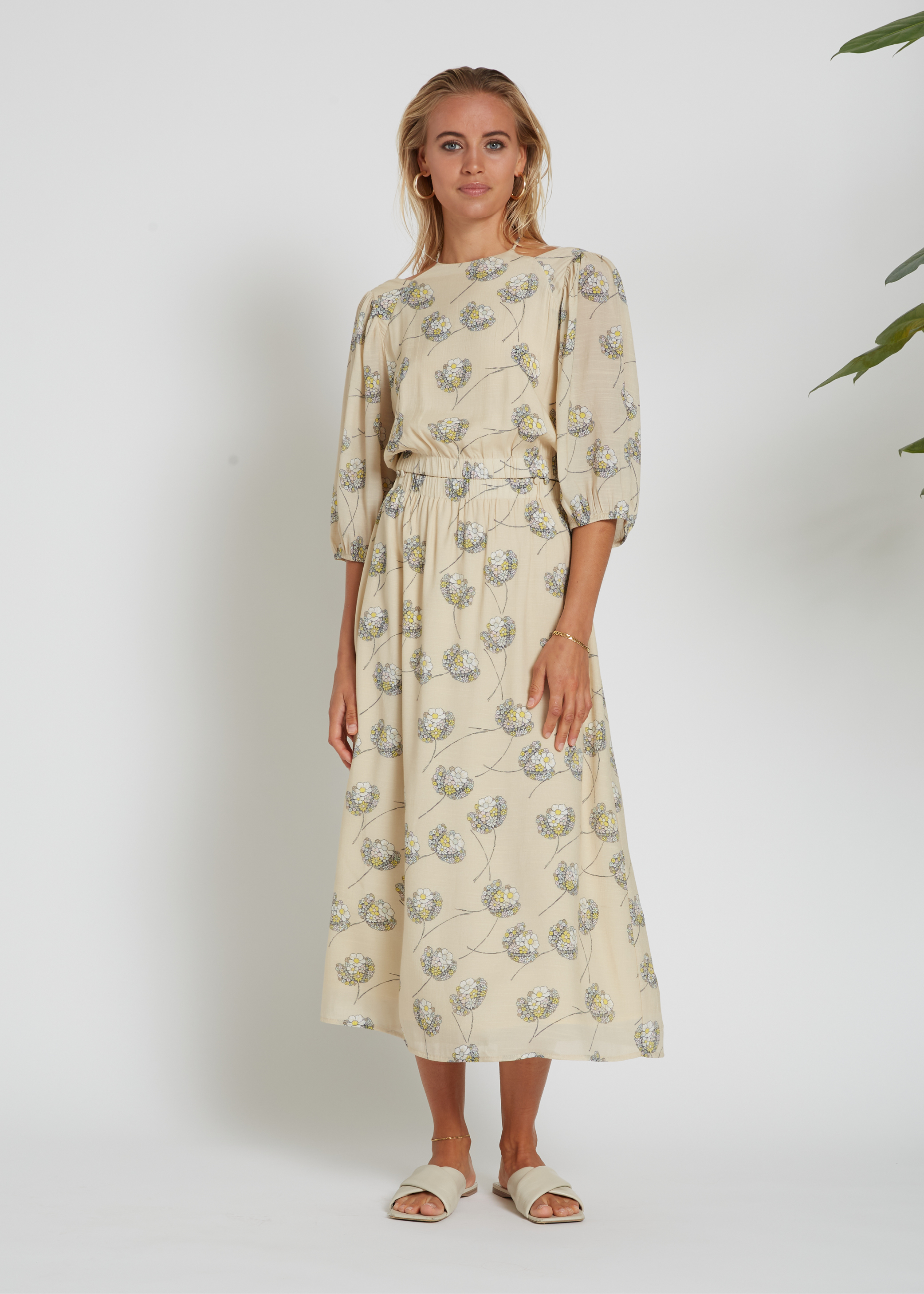 Sættet er syet, så silhuetten er slank, jakken klassisk og bukserne med høj talte og sidelommer.