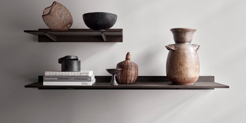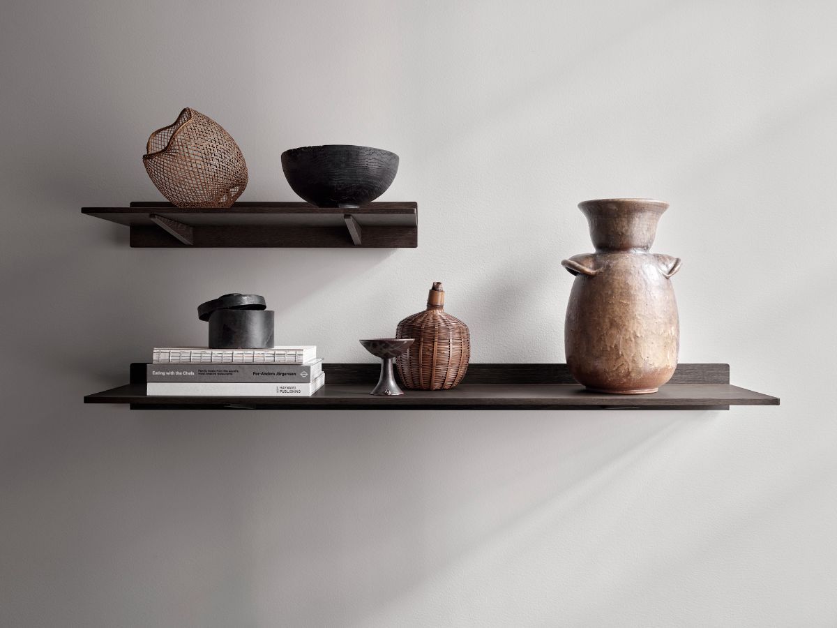 Skabsfronter i riflet, eloxeret aluminium tilføjer en taktil kontrast til den udskårne egetræsramme og Pietra Grey-marmorindsatsen på toppen af ​​skabet. Den mørke egetræsstruktur hviler på spinkle metalben, der giver et let udtryk til det holdbare skab. Vipp fortsætter sin rejse ind i skoven med den nye duo af Vipp478 og Vipp479 hylder i mørk eg. Hylderne fås i 60 og 120 cm længde og kan kombineres i utallige, personlige kompositioner. Hyldepladen er monteret på et smalt, lodret egetræspanel og understøttes af to diskrete hyldebeslag, som får hylden til at se ud til at svæve fra væggen.