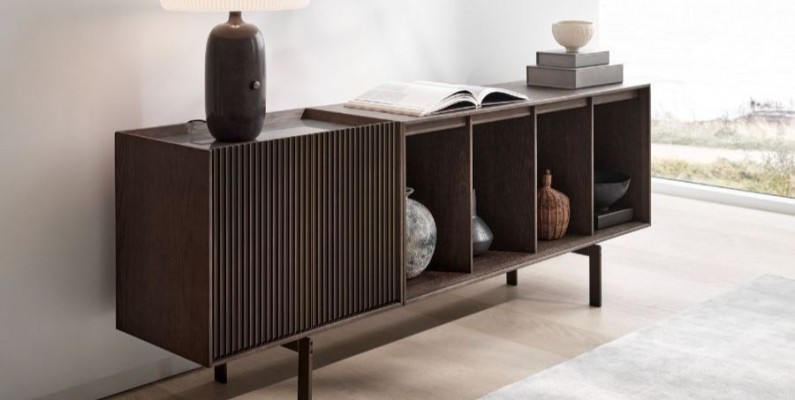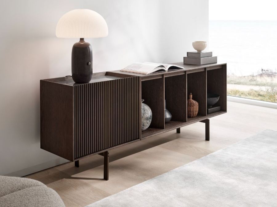 One-size opbevaringsløsningen kombinerer træets naturlige materiale med Vipps varemærke designdetalje - ekstruderet aluminium, som også bruges i Vipps V2 køkken. Skabet er et selvstændigt møbel. Fire åbne hylder til udstillede genstande er kombineret med to lukkede skabe til skjulte genstande i en gratis designet asymmetri.